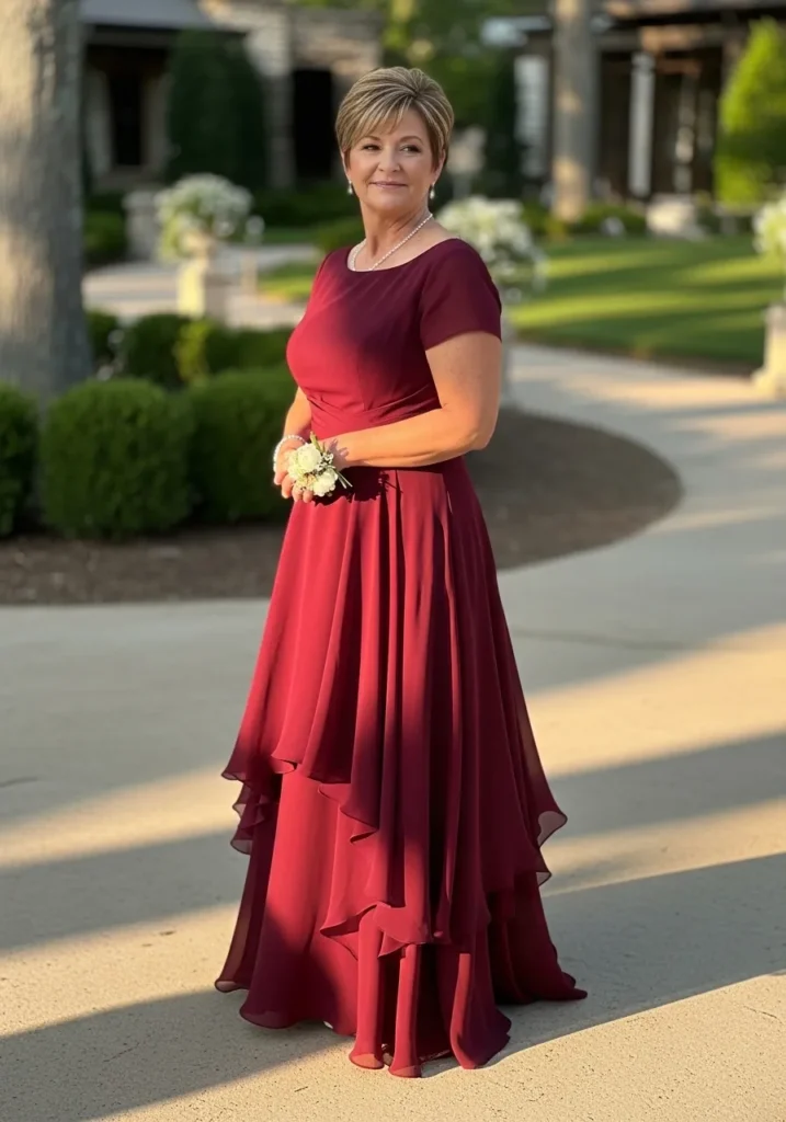 This burgundy chiffon gown features a fitted bodice paired with a beautifully layered skirt that cascades gently to the floor, creating soft movement with every step. The short sleeves and rich wine tone give the dress a refined yet approachable look, while the flowing fabric adds lightness and graceful dimension that feels perfect for outdoor formal celebrations.