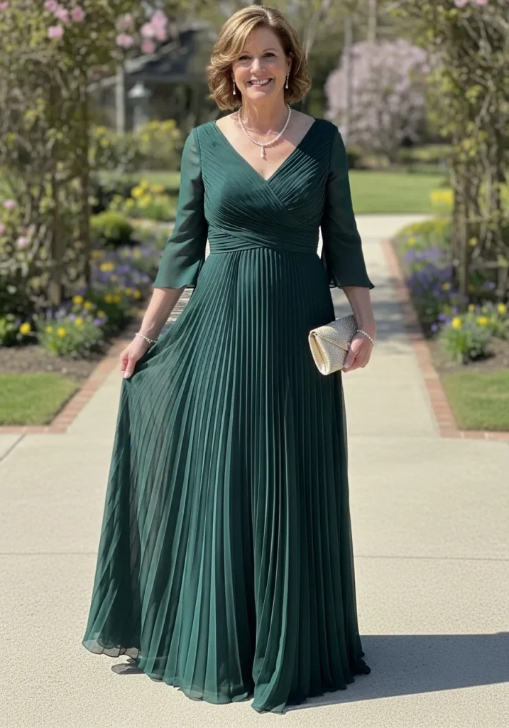 This forest green chiffon gown features delicate pleating and a softly cinched waist that enhances the natural shape. The flowing skirt moves gently with every step, while the rich green tone complements outdoor garden settings beautifully.