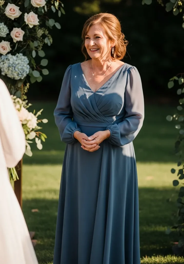 I love how calming and elegant this shade feels, especially in outdoor settings. Dusty blue always gives off that effortless charm, and paired with this flowing silhouette, it creates a look that feels relaxed, refined, and wonderfully chic.