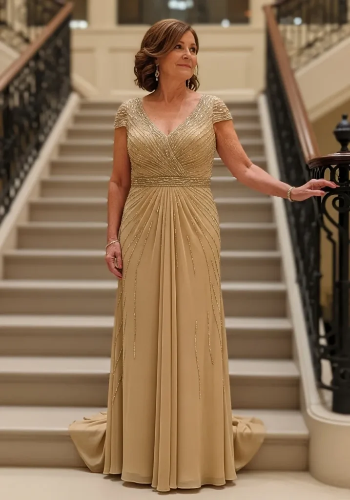I love how glamorous this dress feels while still staying tasteful and refined. The beadwork adds just enough drama to feel special, and the champagne color keeps everything soft, warm, and incredibly flattering.