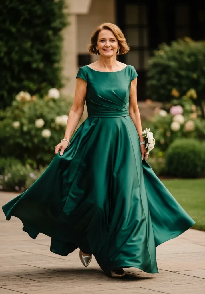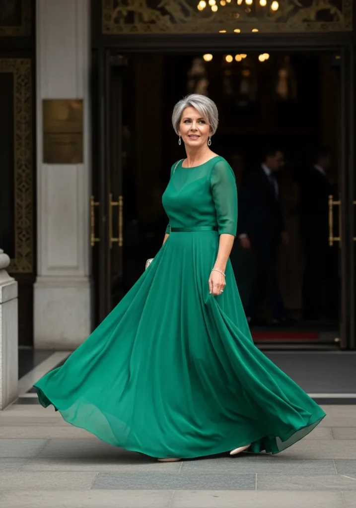 This forest green dress features a fitted top and a full skirt that moves beautifully as the wearer walks. The rich color immediately stands out and feels luxurious and formal. The fabric drapes naturally, adding softness to the structured shape.