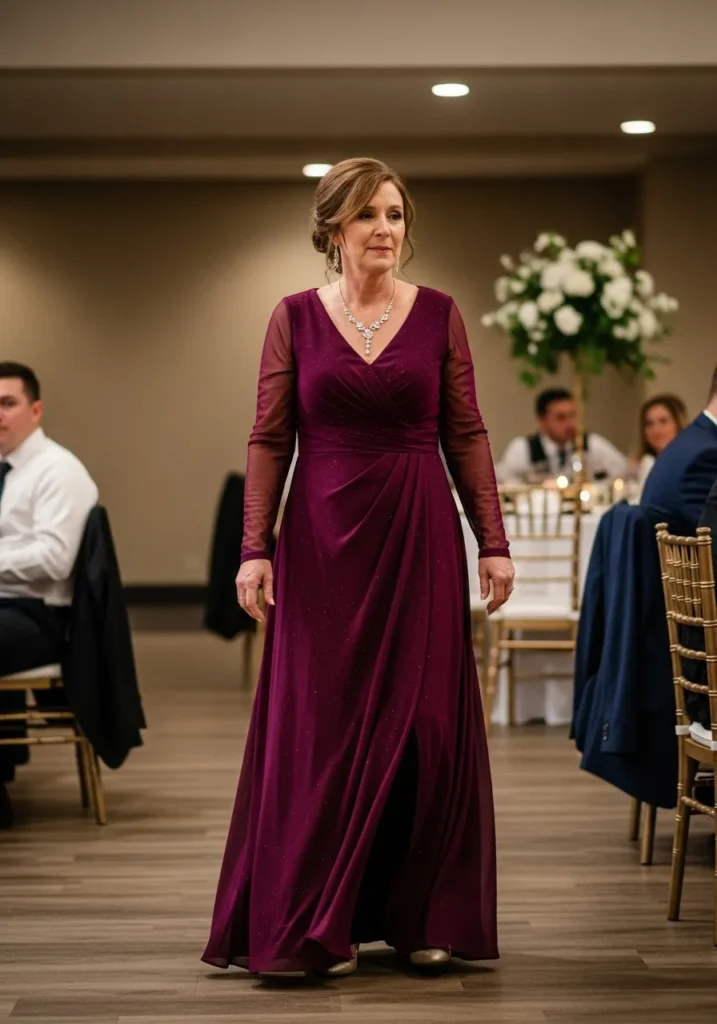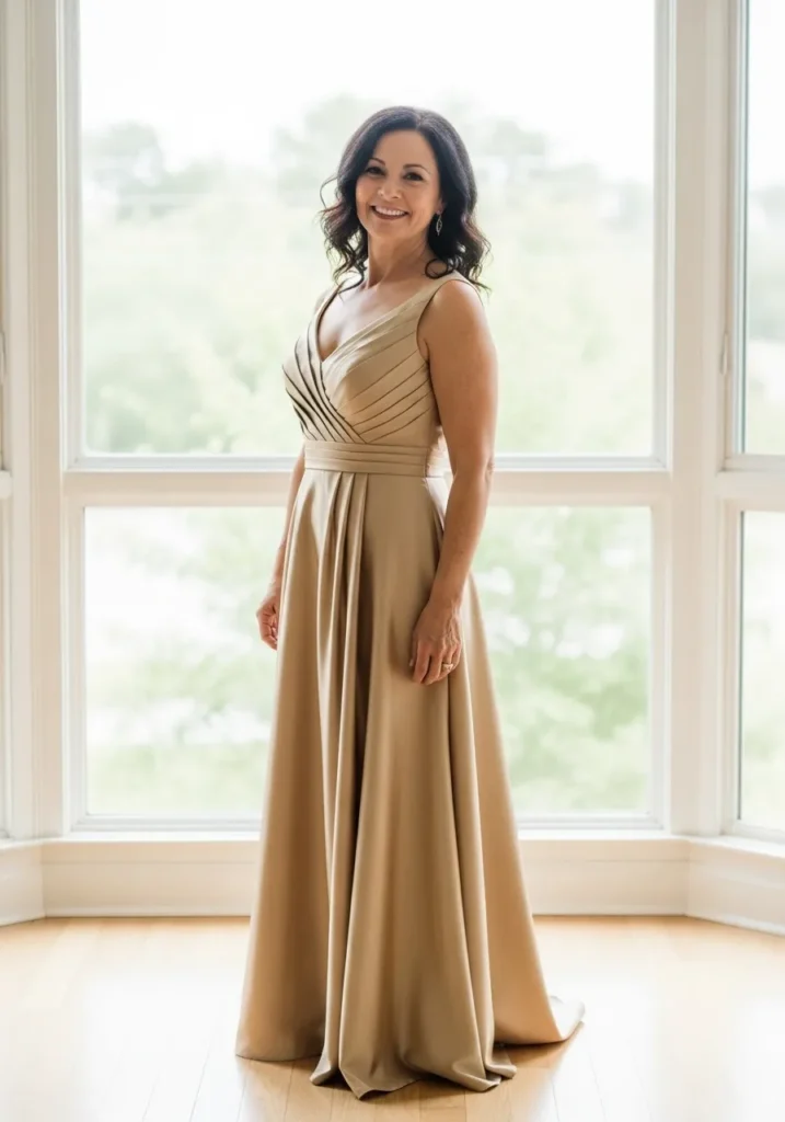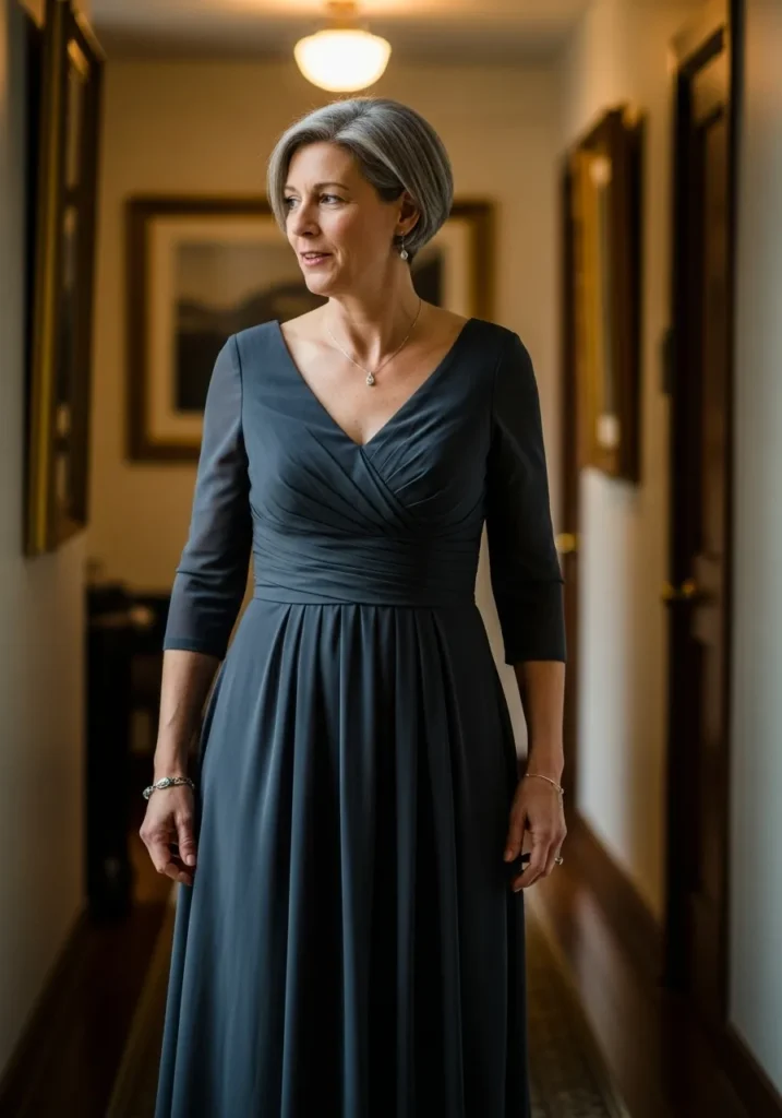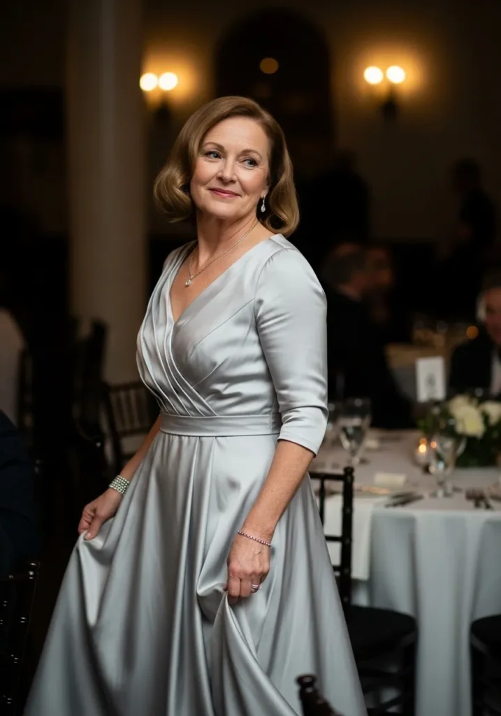 I think this dress is perfect for mothers who love elegance without fuss. It feels sophisticated but not flashy, and the soft draping is incredibly forgiving and flattering. This is one of those looks that quietly steals the show.