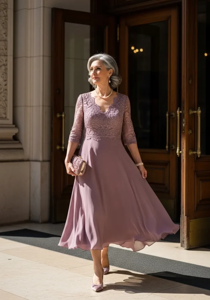 Mauve Lace Dress With Softly Flowing Skirt