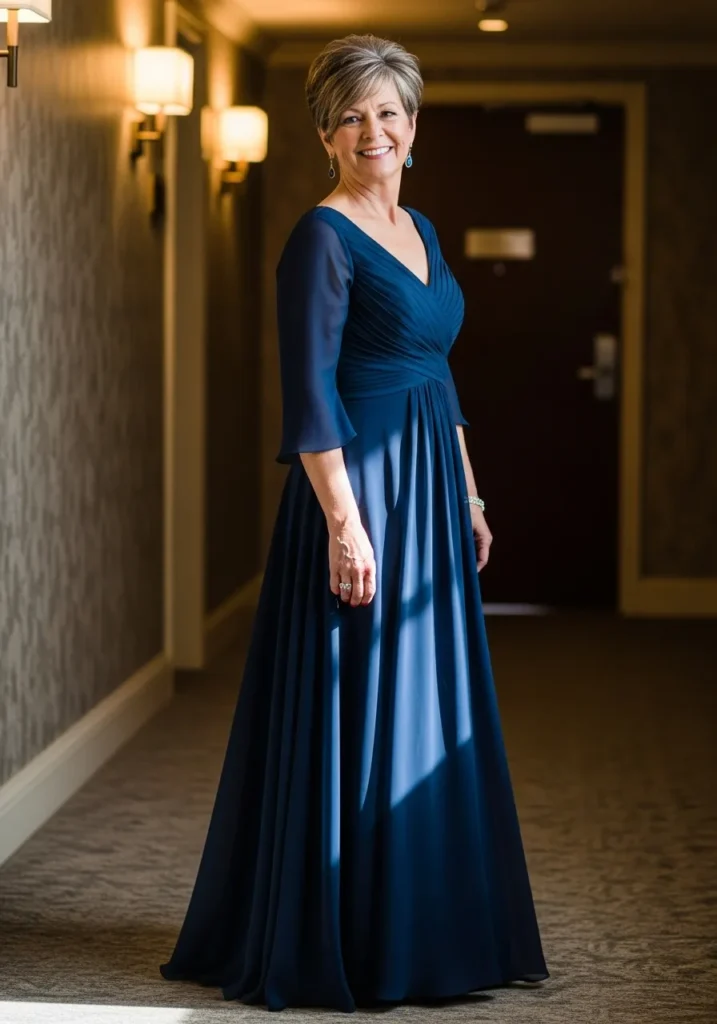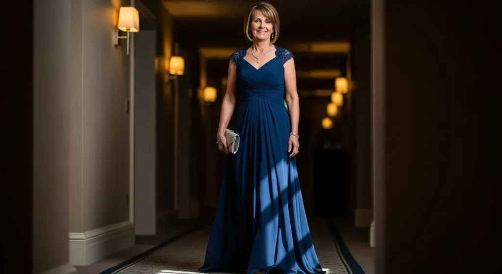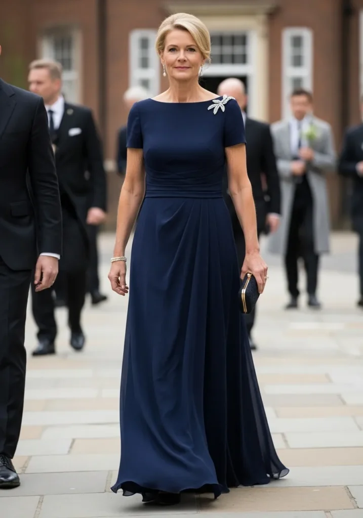 I’m a big fan of navy for mother of the bride looks because it always feels polished and elegant. This dress in particular feels confident and flattering without trying too hard. It’s a safe choice that still feels special.