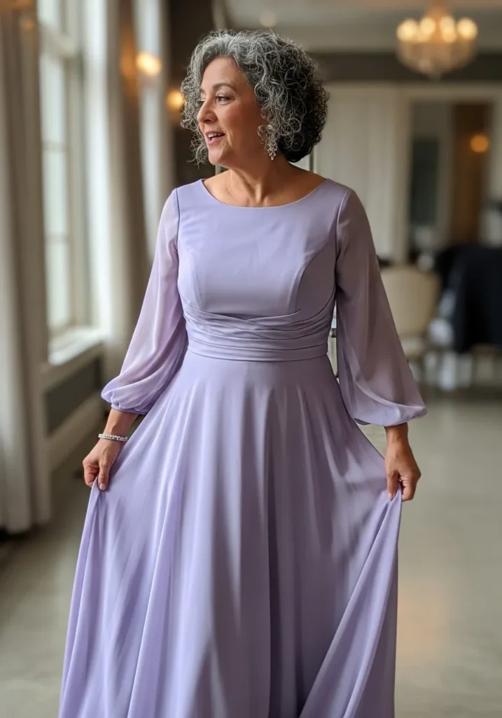 I love how soft and feminine this dress feels. The lavender shade is refreshing and photographs beautifully, especially in bright indoor spaces. It’s perfect for mothers who want something elegant with a gentle and modern twist.
