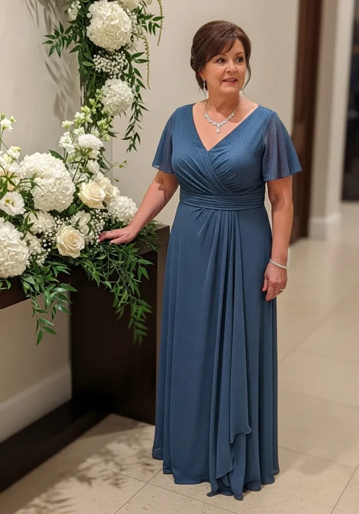 This slate blue gown features a softly wrapped bodice that defines the waist and flows into a long, elegant skirt. The short sleeves offer comfortable coverage while keeping the look formal and polished. The fabric drapes naturally, giving the dress an easy movement that feels graceful and refined.