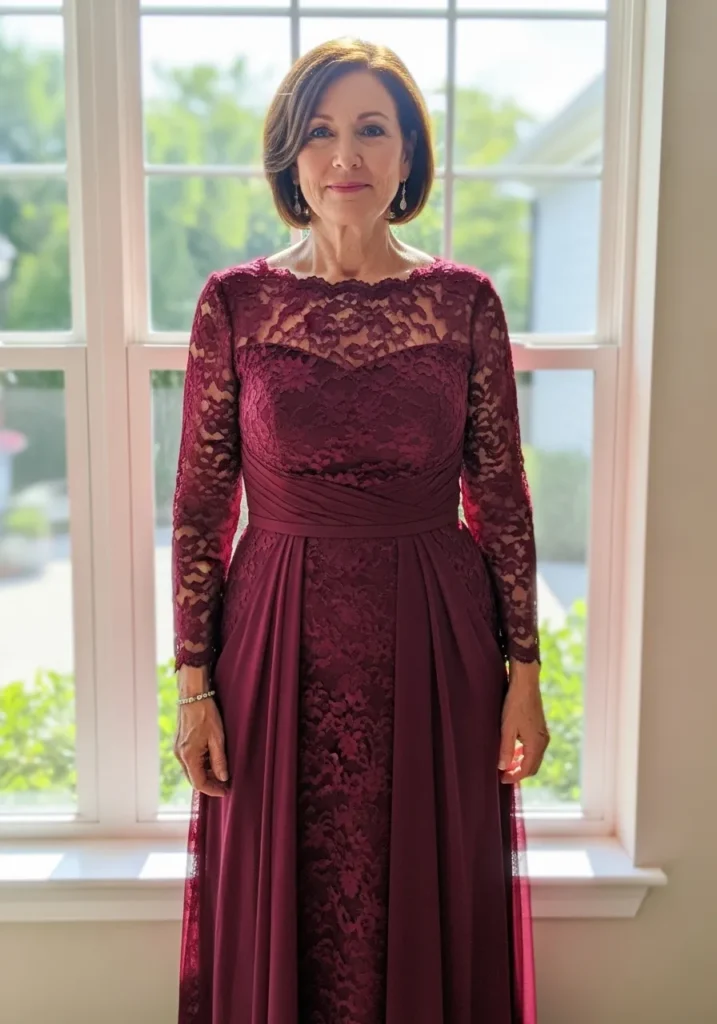 This deep burgundy dress pairs intricate lace across the bodice and sleeves with a flowing skirt that softens the overall look. The long sleeves add coverage while still feeling delicate, and the rich color gives the dress a very polished and formal vibe. The fitted waist keeps the silhouette flattering and balanced.