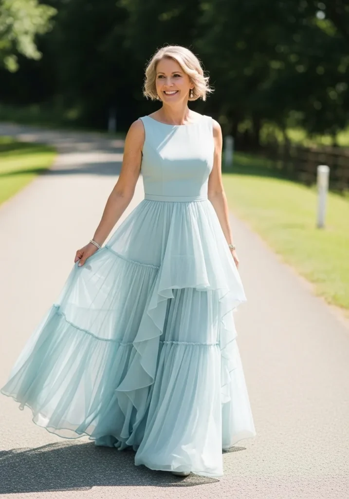 This light blue gown features a gently fitted bodice and a tiered skirt that adds softness and movement. The airy fabric flows beautifully as you walk, creating a light and romantic feel. The pale blue color feels fresh and formal without leaning too bridal.