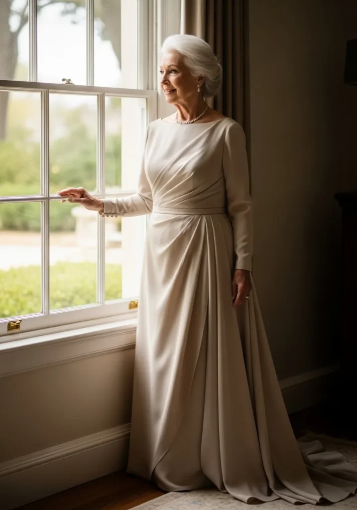 This soft beige gown features a modest neckline and long sleeves paired with a flowing skirt. The fabric drapes smoothly and creates a relaxed yet formal silhouette. The neutral tone feels warm, elegant, and timeless.