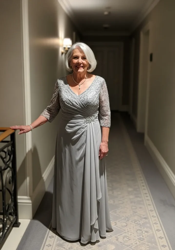 This silver gray gown features a gently draped bodice and a flowing skirt that falls effortlessly to the floor. The subtle shimmer in the fabric gives it an elegant glow under indoor lighting, while the relaxed fit keeps it comfortable and wearable. The overall look is calm, graceful, and beautifully understated.