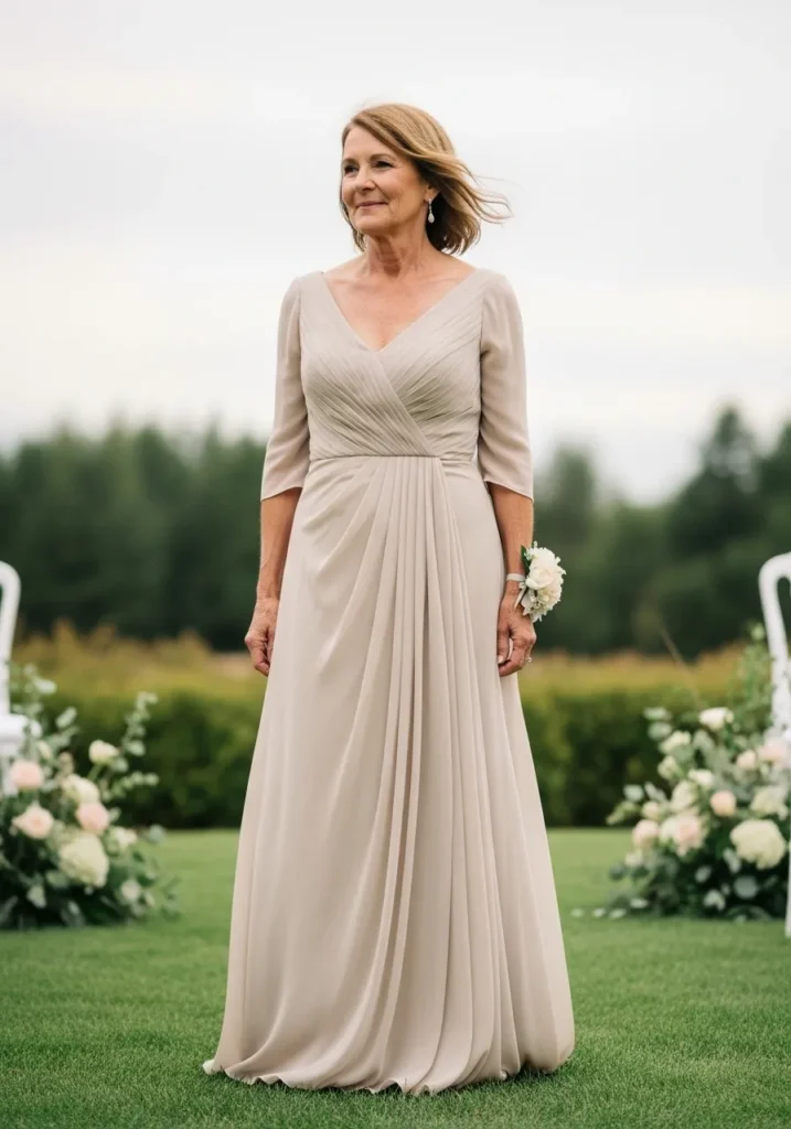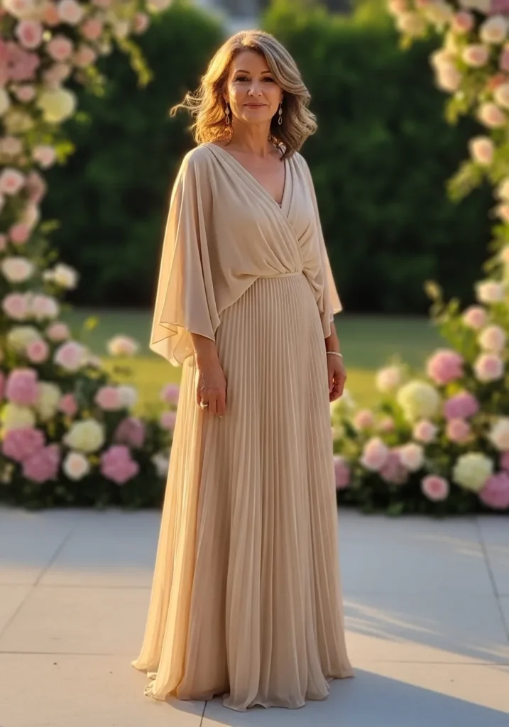 A flowing champagne chiffon wrap gown with gentle pleating and a softly defined waist, featuring a flattering V neckline and relaxed sleeves that create a light, airy silhouette perfect for an outdoor wedding setting. The fabric drapes naturally and moves beautifully with every step, giving the whole look a soft romantic feel.