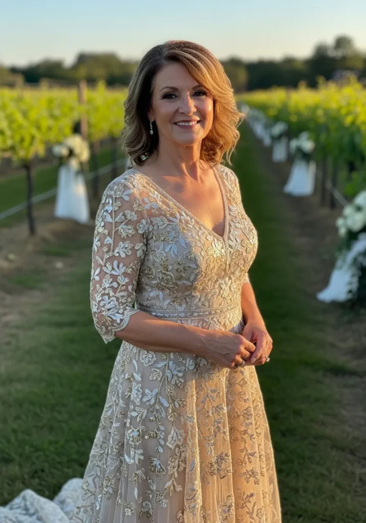 I think this look is pure romance. It feels sweet, graceful, and timeless, and it is the kind of dress that makes a mother of the bride look elegant without ever feeling overdressed.