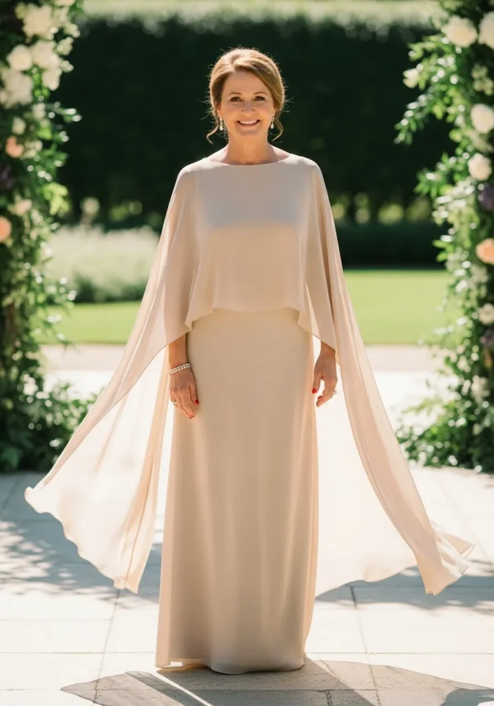 This style feels incredibly elegant in the most natural way. I adore how the cape sleeves add a subtle touch of drama while still keeping the overall look relaxed, flattering, and timeless.