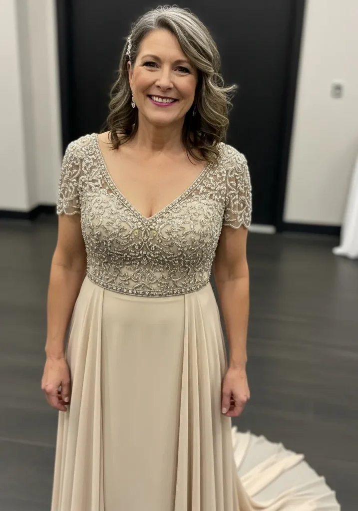 I love how this gown feels luxurious without being overly bold. The subtle sparkle gives just the right amount of glamour, making it ideal for mothers who want to shine in a tasteful and sophisticated way.