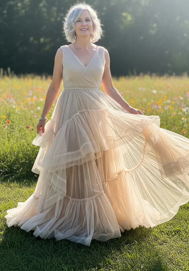 I love how light and joyful this gown feels because it looks effortless yet incredibly elegant. The soft layers add just enough drama without feeling heavy, making it ideal for mothers who want a graceful and feminine look that still feels comfortable and easy to wear.