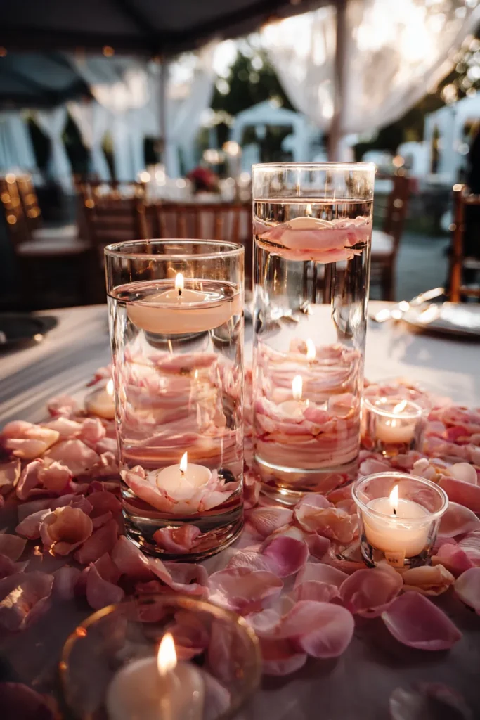 Clear glass cylinders filled with water hold softly floating candles and layers of blush rose petals that drift gently beneath the flame. The table surface is scattered with matching petals, creating a romantic glow as small votive candles flicker around the arrangement. Sheer draping and warm light in the background make the whole setting feel dreamy and intimate, especially as the evening light settles in.