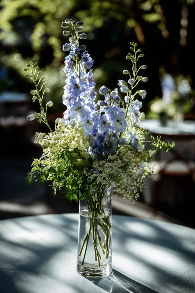 Tall stems of soft blue delphinium rise gracefully from a clear glass cylinder vase, paired with delicate white filler flowers and fresh green foliage. The arrangement feels light and natural, with loose stems visible through the water and gentle sunlight casting soft shadows across the table. The simple glass vase keeps the focus on the flowers while adding a clean and modern touch that works beautifully for an outdoor or garden inspired setting.