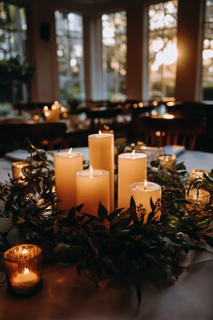 A cluster of ivory pillar candles sits at the center of the table, surrounded by lush greenery and tiny votive candles that cast a warm golden glow. The candles vary in height, creating soft visual interest, while the greenery weaves naturally around them for a relaxed and romantic feel. Set in a softly lit room with large windows and evening light filtering through, the whole table feels cozy and intimate without feeling heavy.