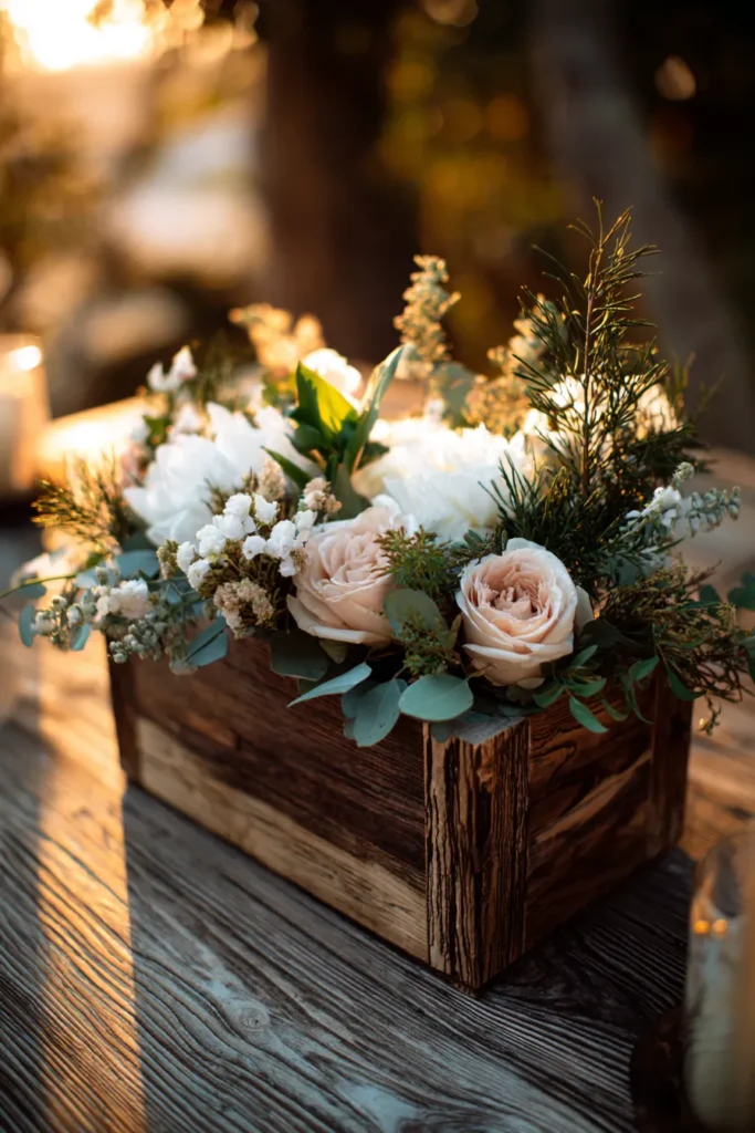 Soft blush roses and creamy white blooms are nestled into a handcrafted wooden box, layered with eucalyptus leaves and airy filler flowers. The wood looks beautifully weathered, adding texture and warmth, while the florals spill naturally over the edges for a relaxed and organic feel. Candlelight glows nearby and the whole arrangement sits on a rustic table that feels perfect for an outdoor or barn inspired spring celebration.