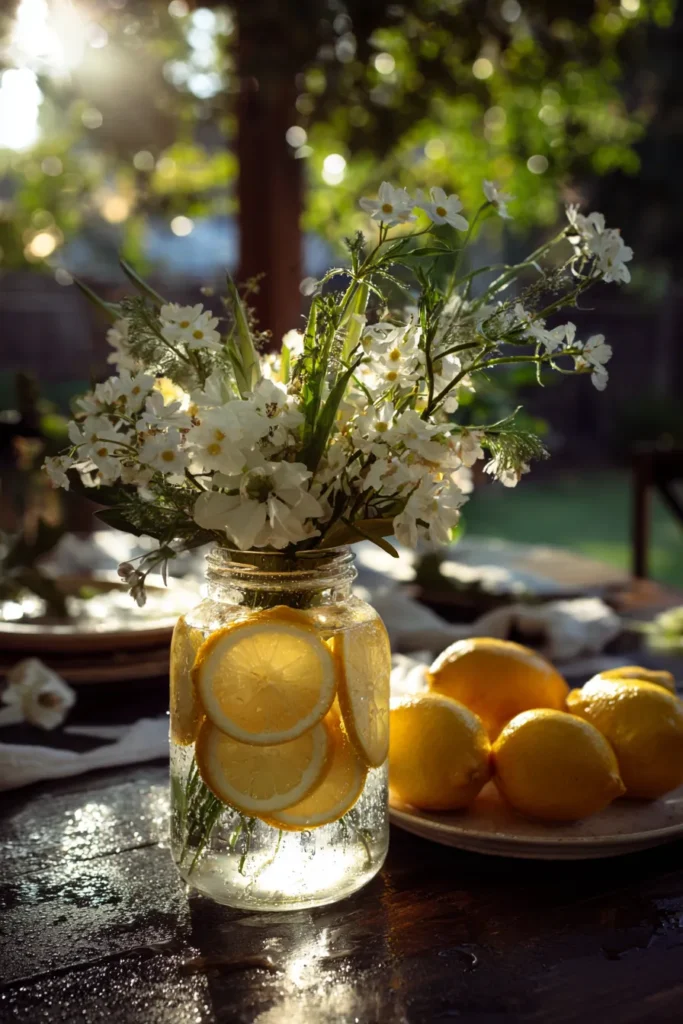 Delicate white wildflowers and soft greenery are arranged inside a clear glass jar filled with water and thin slices of fresh lemon. The lemons catch the sunlight beautifully and add a cheerful pop of yellow against the natural wood table. Nearby bowls of whole lemons and simple tableware complete the look, giving the entire setup a relaxed outdoor spring feeling that feels bright and natural.