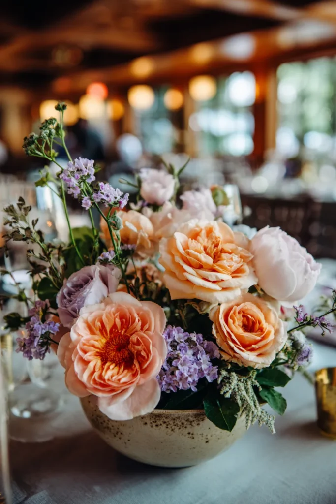 Blush peach garden roses take center stage in a low speckled ceramic bowl, surrounded by pale lavender accents, soft greenery, and delicate filler blooms. The flowers are arranged loosely with varied heights, giving the centerpiece a natural just gathered look. Set against a softly lit reception space, the warm tones of the roses stand out beautifully while still feeling gentle and romantic.