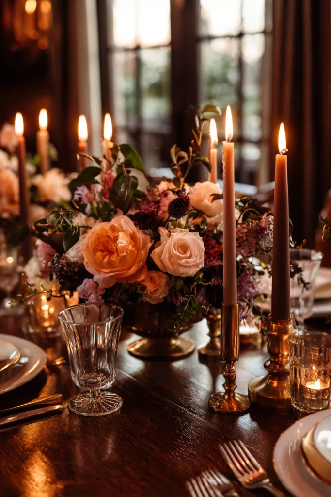 Soft peach and blush roses sit low in classic gold bowls, surrounded by deep greenery and tiny accent blooms. Tall tapered candles in warm neutral tones rise above the flowers in polished brass holders, casting a gentle glow across the wooden table. Crystal glassware and simple place settings complete the look, creating a rich and intimate atmosphere that feels perfect for an evening celebration.