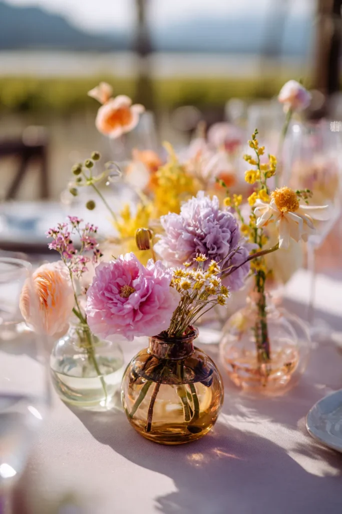 I love how joyful and relaxed this centerpiece feels. It has that effortless garden party energy that never feels forced or too styled. The mix of colors makes the table feel lively and personal, like every little vase tells its own story. This is the kind of setup that feels welcoming right away and makes guests smile as soon as they sit down.