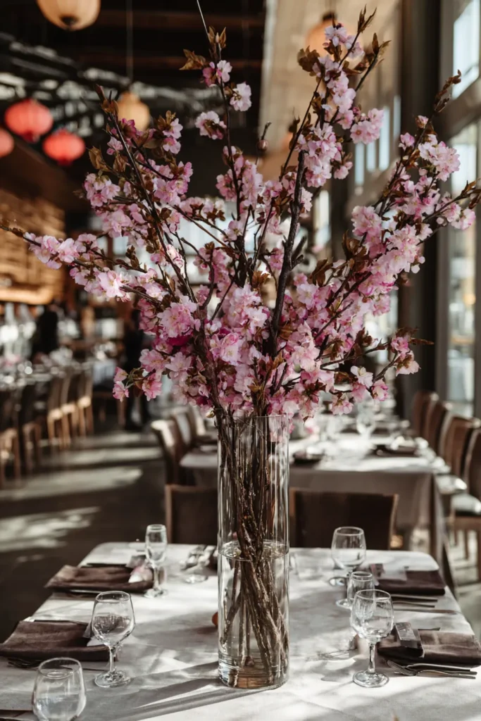 Soft pink cherry blossom branches rise gracefully from a clear glass cylinder vase, creating height and movement at the center of the table. The slender branches fan outward naturally, filling the space with delicate blooms while the visible stems in water keep the look clean and airy. Set in a light filled venue with simple table settings, the centerpiece feels dramatic without overwhelming the table.