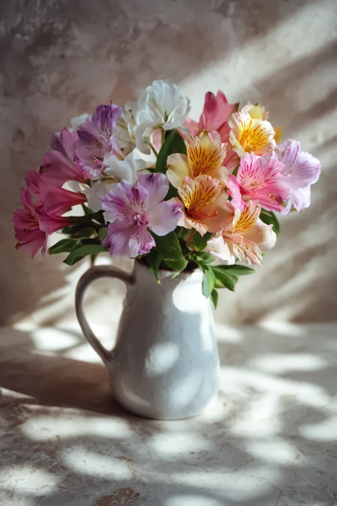 A soft mix of pastel wildflowers fills a simple ceramic pitcher, with blooms in blush pink, creamy yellow, lavender, and white spilling out naturally. The petals catch the light beautifully, creating gentle shadows across the table and giving the arrangement a relaxed freshly picked feel. The neutral pitcher keeps everything grounded and lets the colorful flowers shine without feeling busy.