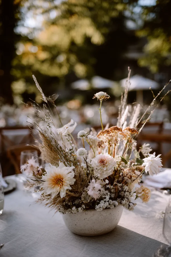 A low ceramic bowl holds a softly textured mix of dried wildflowers, airy grasses, and creamy neutral blooms. The arrangement blends warm beige tones with hints of soft blush and ivory, creating an organic look that feels natural and relaxed. Set on a simple linen covered table outdoors, the centerpiece feels perfectly at home surrounded by greenery and filtered sunlight.