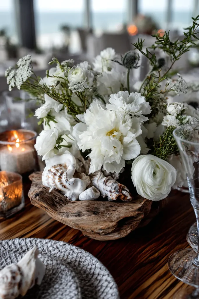 A natural driftwood bowl holds a soft arrangement of white blooms mixed with airy greenery and delicate textures. Creamy flowers are tucked alongside sculptural seashells, creating a layered look that feels organic and coastal inspired. Warm candlelight and glassware surround the centerpiece, while the ocean view in the background adds an effortless seaside charm.