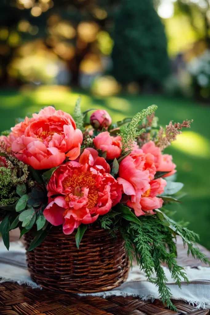 Bold coral peonies spill generously from a woven basket, layered with fresh greenery and soft filler stems for a lush garden look. The petals feel full and textured, with rich color that instantly stands out against the natural wood table and green outdoor backdrop. The basket adds warmth and structure while keeping the arrangement relaxed and perfectly suited for an open air spring celebration.