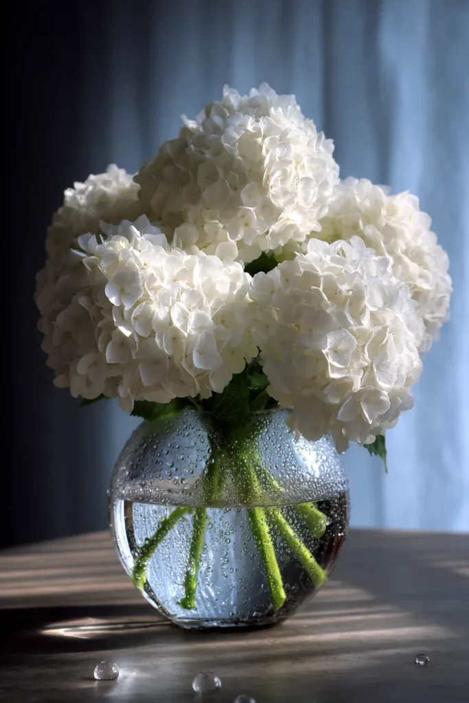 A rounded glass bowl holds full white hydrangea blooms with fresh green stems visible through the clear water. Tiny droplets cling to the glass, catching the light and giving the arrangement a crisp just picked feel. The soft white petals create a cloud like shape that feels balanced and elegant without being overdone.