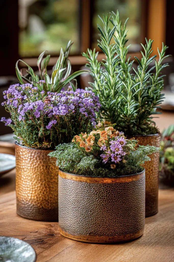 A collection of potted herbs and flowering plants sits in textured metallic containers, bringing natural greenery right onto the table. Rosemary stands tall with its structured shape, while soft purple blooms and mossy details fill in around it for a layered garden look. The warm metal pots add a subtle glow and contrast beautifully with the fresh green tones.