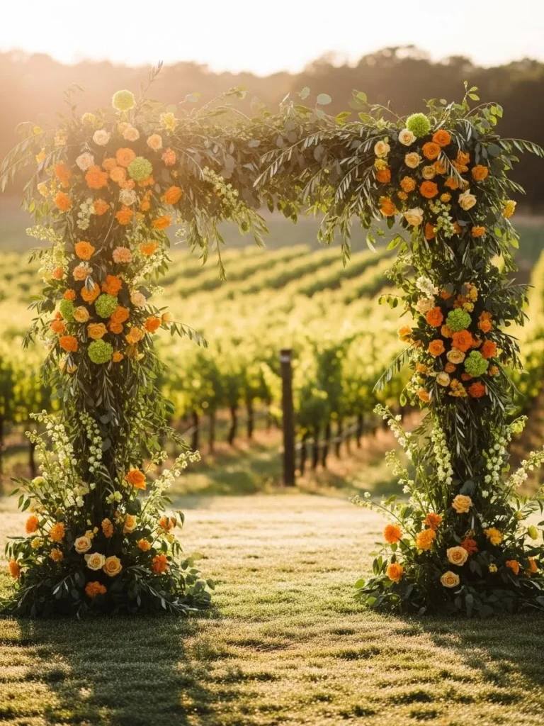 This ceremony arch is overflowing with greenery and bright citrus blooms, creating a fresh and joyful focal point. The mix of leafy textures and pops of orange flowers feels natural and sun soaked, especially set against a vineyard or open landscape.