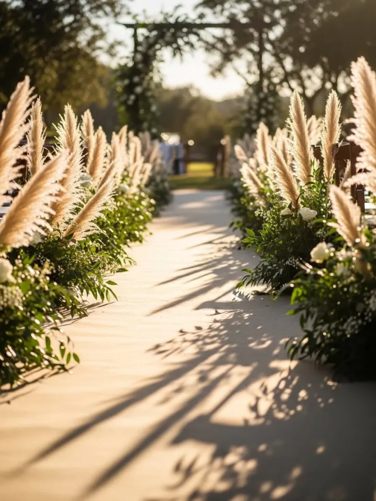 Tall arrangements of pampas grass and greenery line the ceremony aisle, creating a natural pathway filled with texture. The warm tones glow softly in the sunlight, adding depth without overpowering the space.