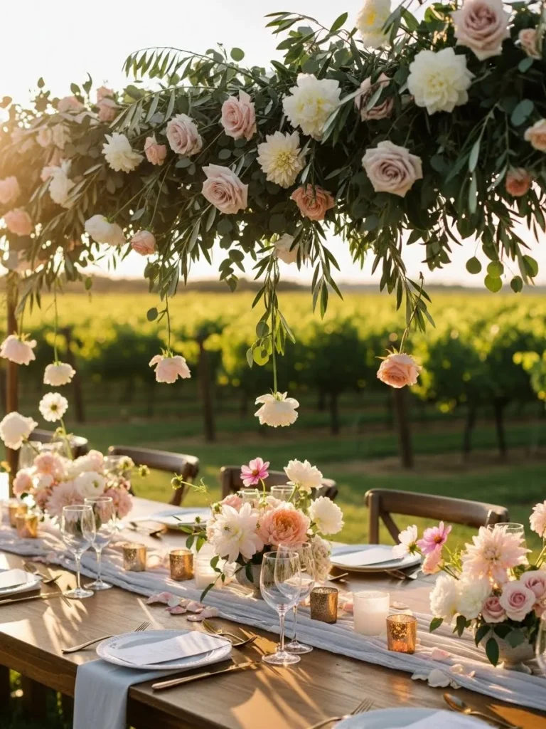 I love how this setup feels intimate without being heavy. The flowers overhead make the table feel extra special, like guests are dining inside a garden moment rather than just sitting at a table.