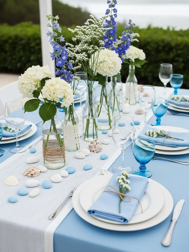 This tablescape blends soft blue linens with crisp white plates, clear glass vases, and fresh blue and white florals. Light wood accents and airy spacing keep the look fresh and relaxed.