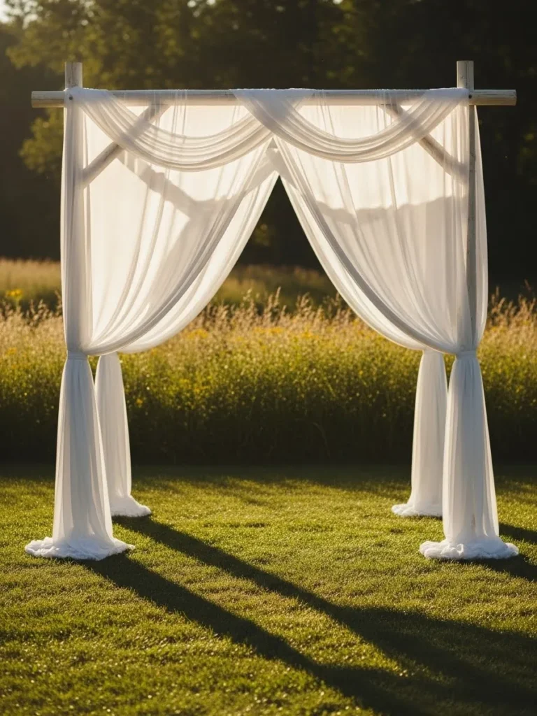 A simple wooden ceremony frame is wrapped in flowing white fabric that moves gently in the breeze. The open meadow setting and minimal greenery keep the design clean and serene.