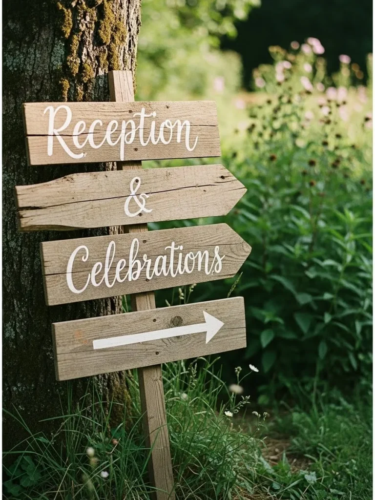 A wooden signpost with hand painted lettering guides guests toward the reception and celebration areas. The natural wood and greenery surroundings give it a relaxed and charming feel.