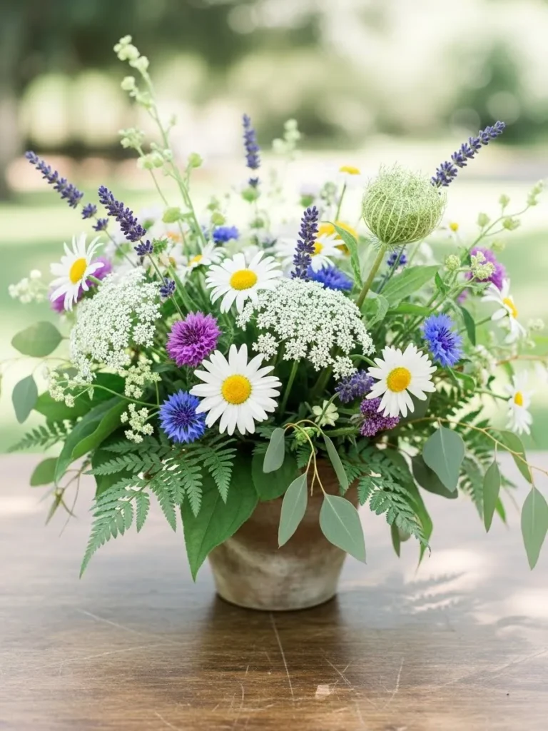 This centerpiece features daisies, lavender tones, and fresh greenery arranged in a simple neutral vase. The mix of textures and colors gives it a freshly gathered look.
