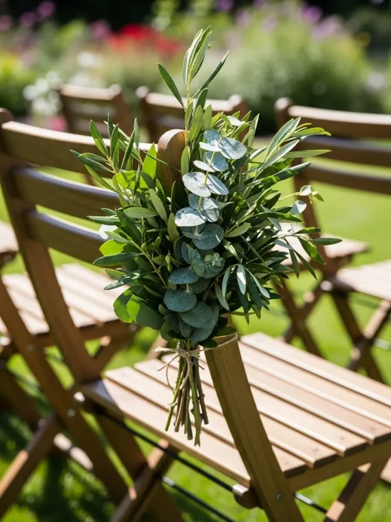 Simple wooden chairs are decorated with small bundles of greenery tied neatly at the back. The clean lines and natural foliage keep the look understated and elegant.