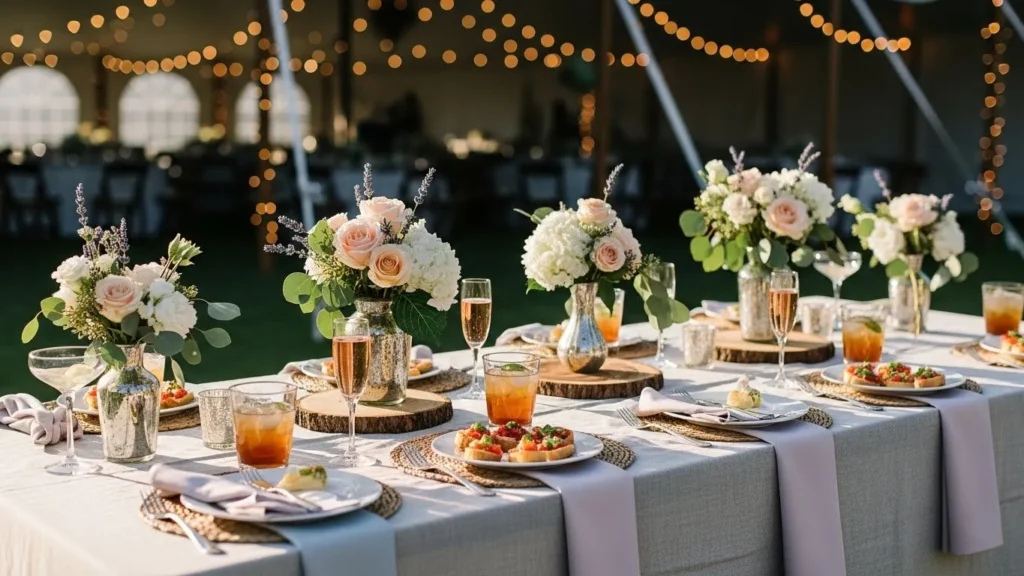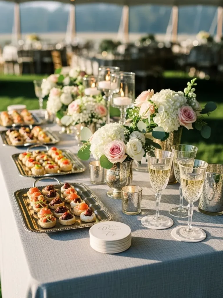 This cocktail table setup features soft blush and cream florals arranged alongside sparkling glassware and neatly plated bites. The neutral linens and gentle candlelight keep everything feeling refined while still relaxed in an outdoor setting.