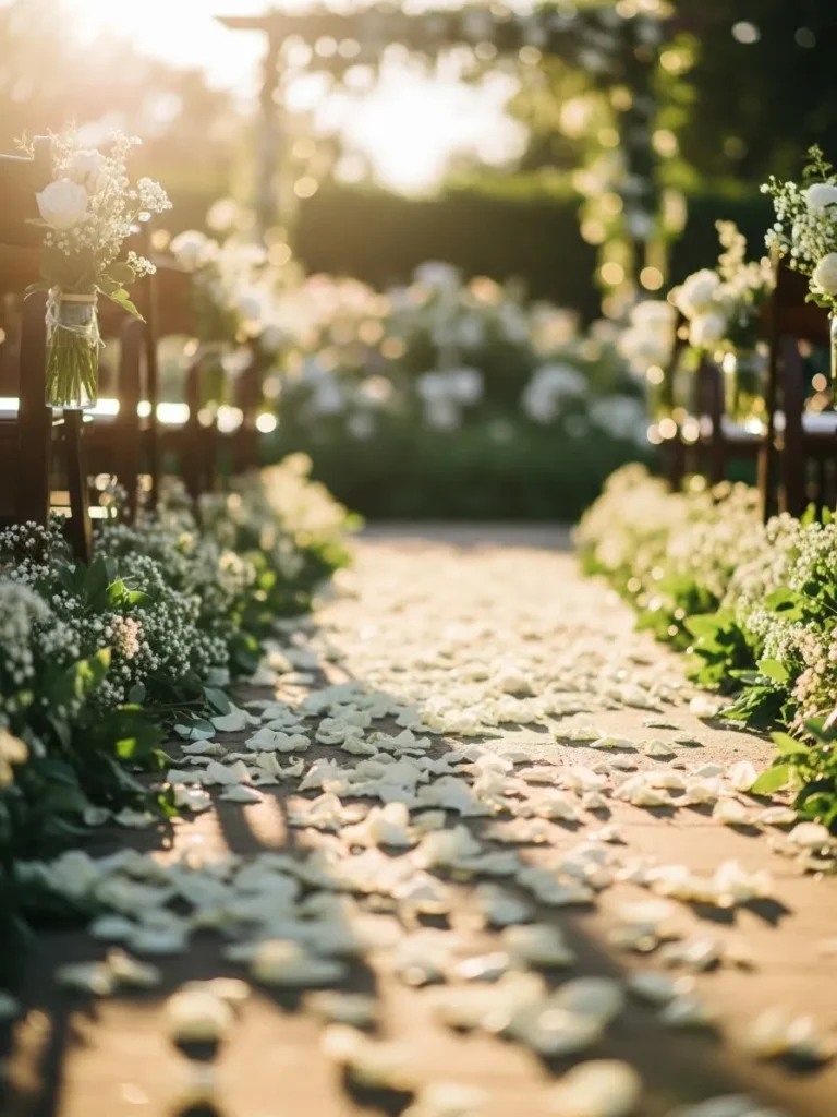 This ceremony aisle is softly covered in pale flower petals and framed by low greenery along the sides. Warm sunlight filters through the trees, creating a romantic and glowing pathway.
