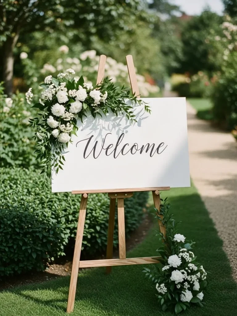 A clean white welcome sign sits on a wooden easel, framed by soft white florals and lush greenery. The surrounding garden setting keeps everything feeling fresh, simple, and beautifully coordinated.