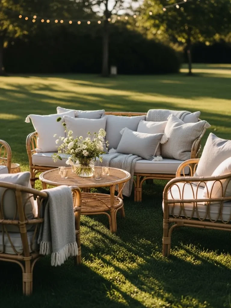 This outdoor lounge area uses woven seating, plush cushions, and low wooden tables arranged on fresh grass. Neutral tones and soft florals make the space feel relaxed while still looking styled and intentional.