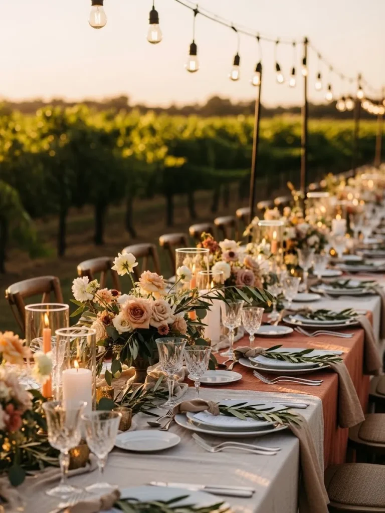 Long tables stretch through a vineyard setting with soft linens, glowing candles, and delicate floral arrangements. String lights above add a warm glow as the sun sets, creating an intimate and inviting atmosphere.