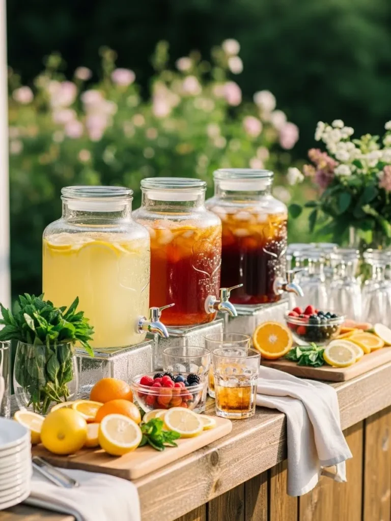 A wooden drink station displays glass dispensers filled with citrus infused drinks alongside fresh fruit and greenery. The styling is simple, bright, and practical while still looking beautiful and thoughtfully arranged.