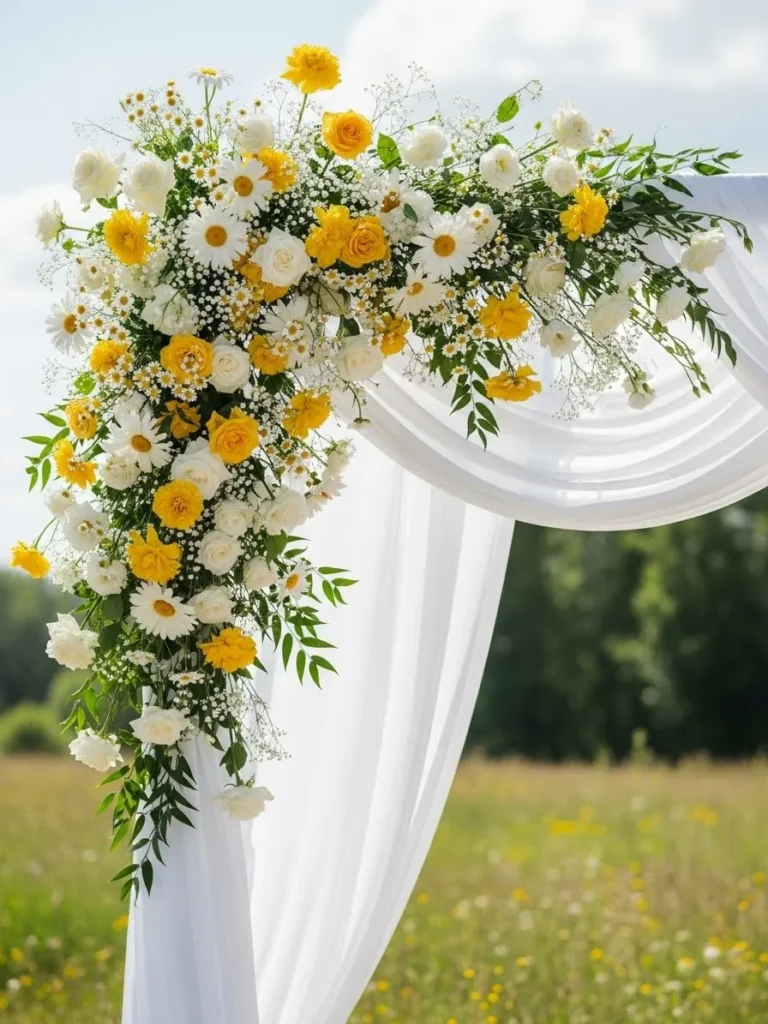 This floral arch detail features soft white daisies mixed with sunny yellow blooms and flowing white fabric. The greenery adds movement while the draping keeps everything light and romantic against an open meadow backdrop.