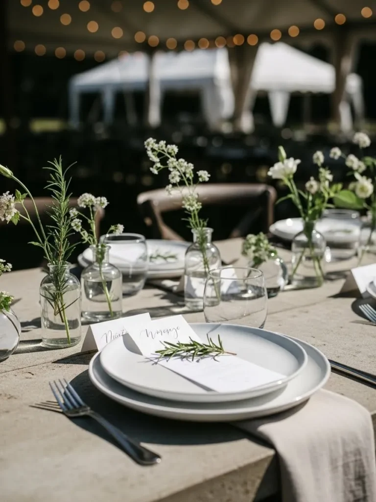 This table setting keeps things simple with neutral linens, layered white plates, and small sprigs of greenery at each place. Clear glassware and understated florals allow the outdoor setting to shine.